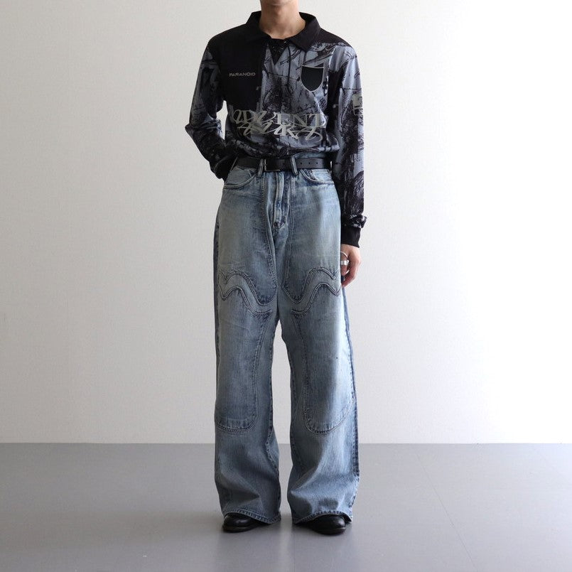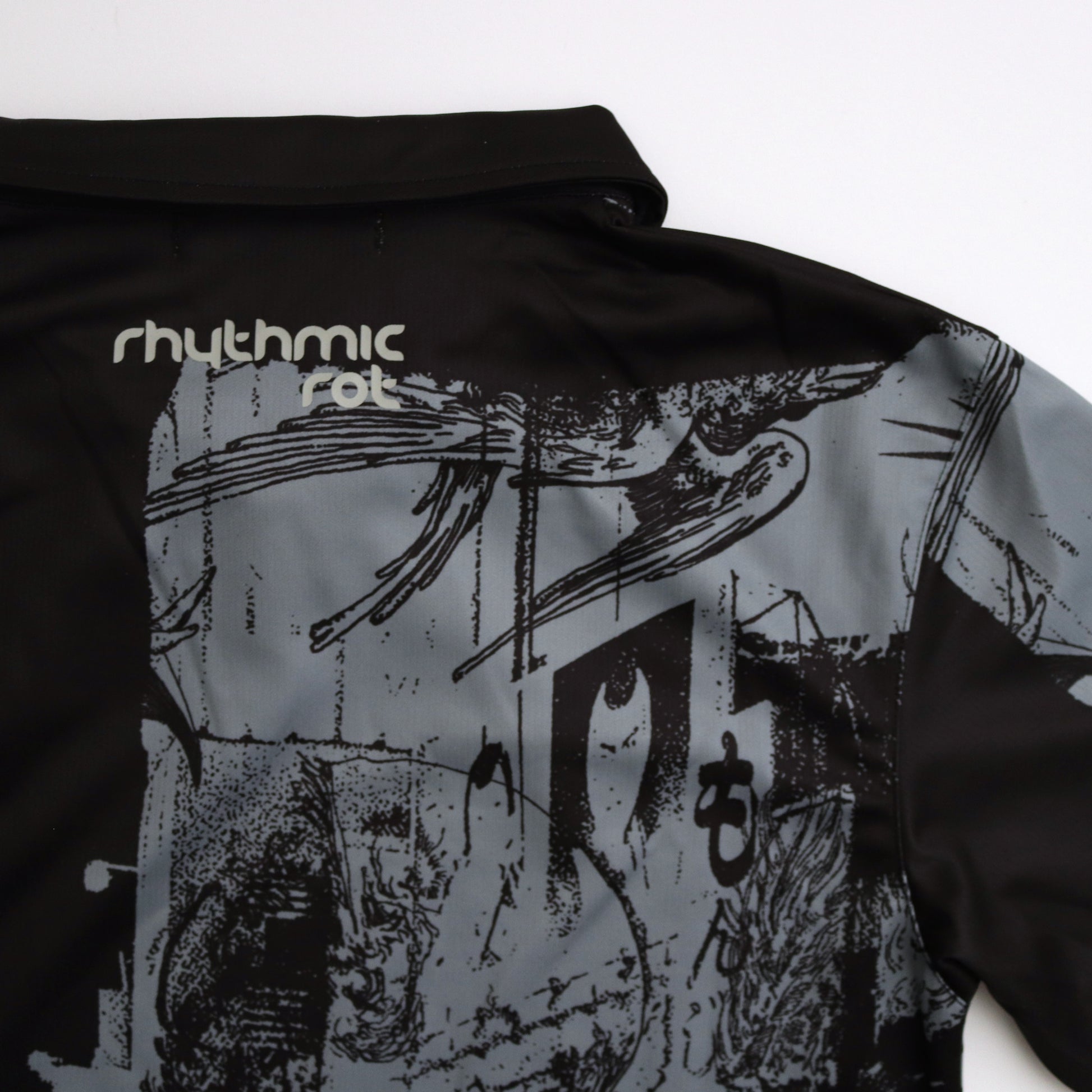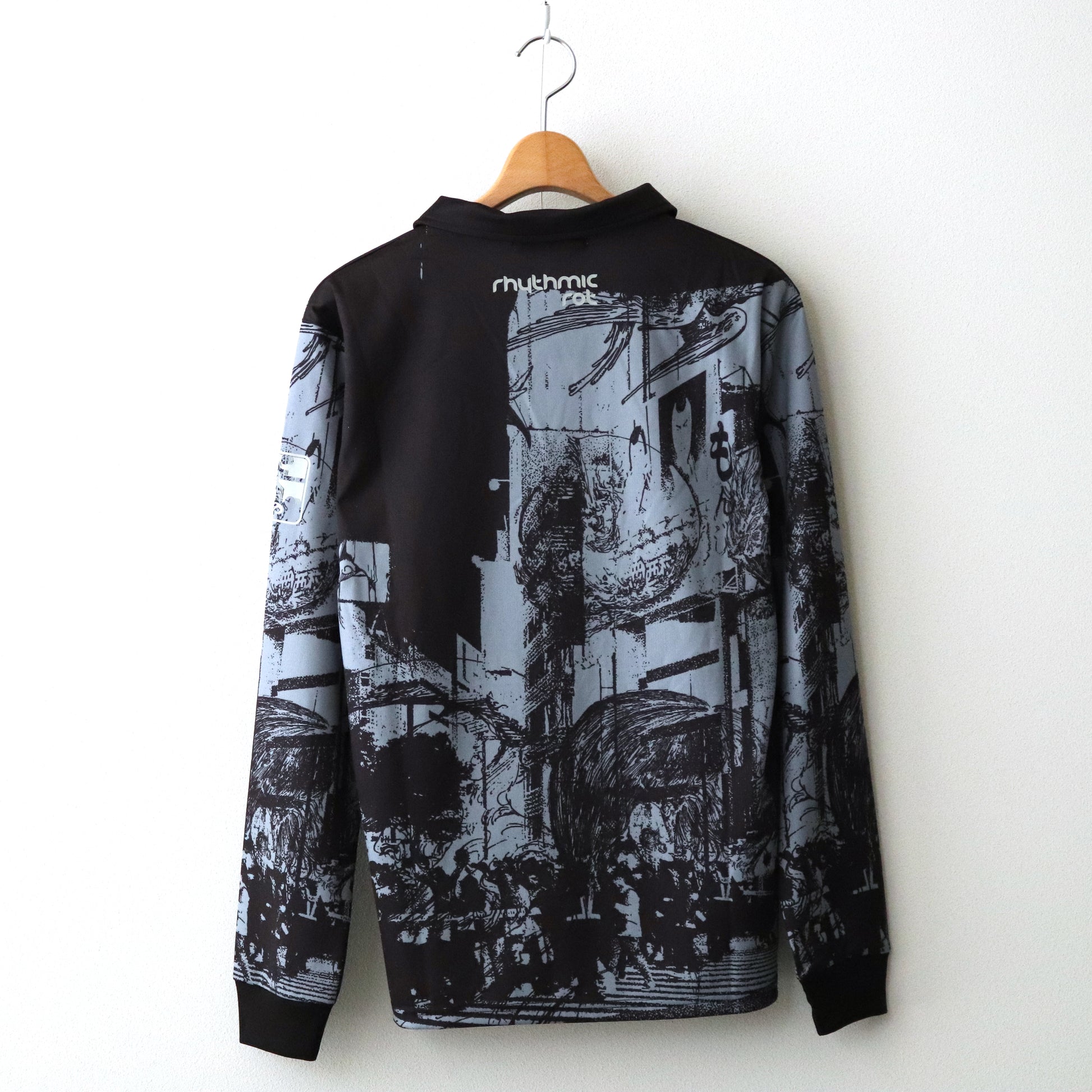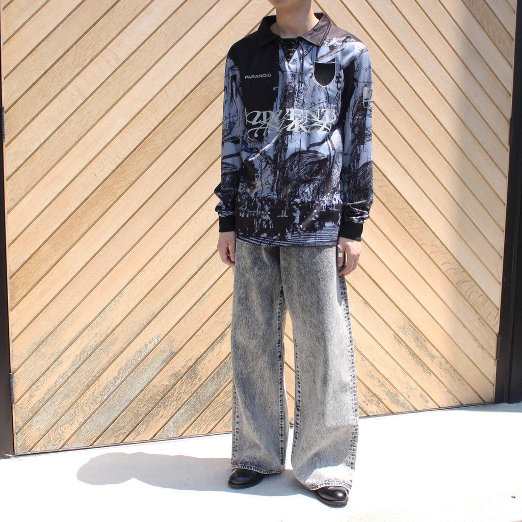 PARANOIDのゲームシャツ。光沢のある生地感とインパクトのあるグラフィックが特徴。襟元のレースアップと袖はリブ切り替え。フロントにはブランドロゴ刺繡。 総柄のグラフィックデザインにはデザイナー自ら撮影した渋谷の街並みにシーズンテーマである “RYUKAI”を彷彿とさせるイラストを重ねた。