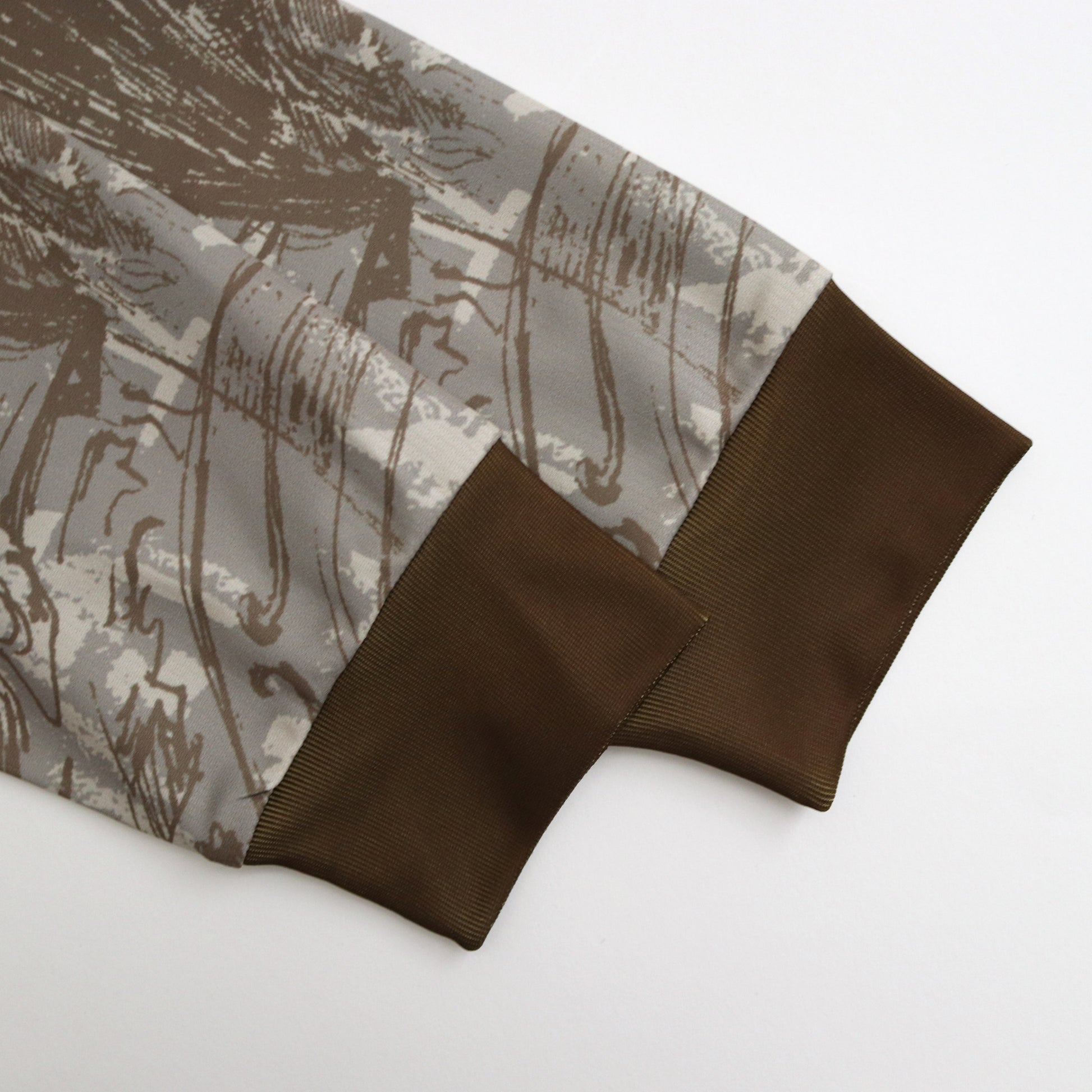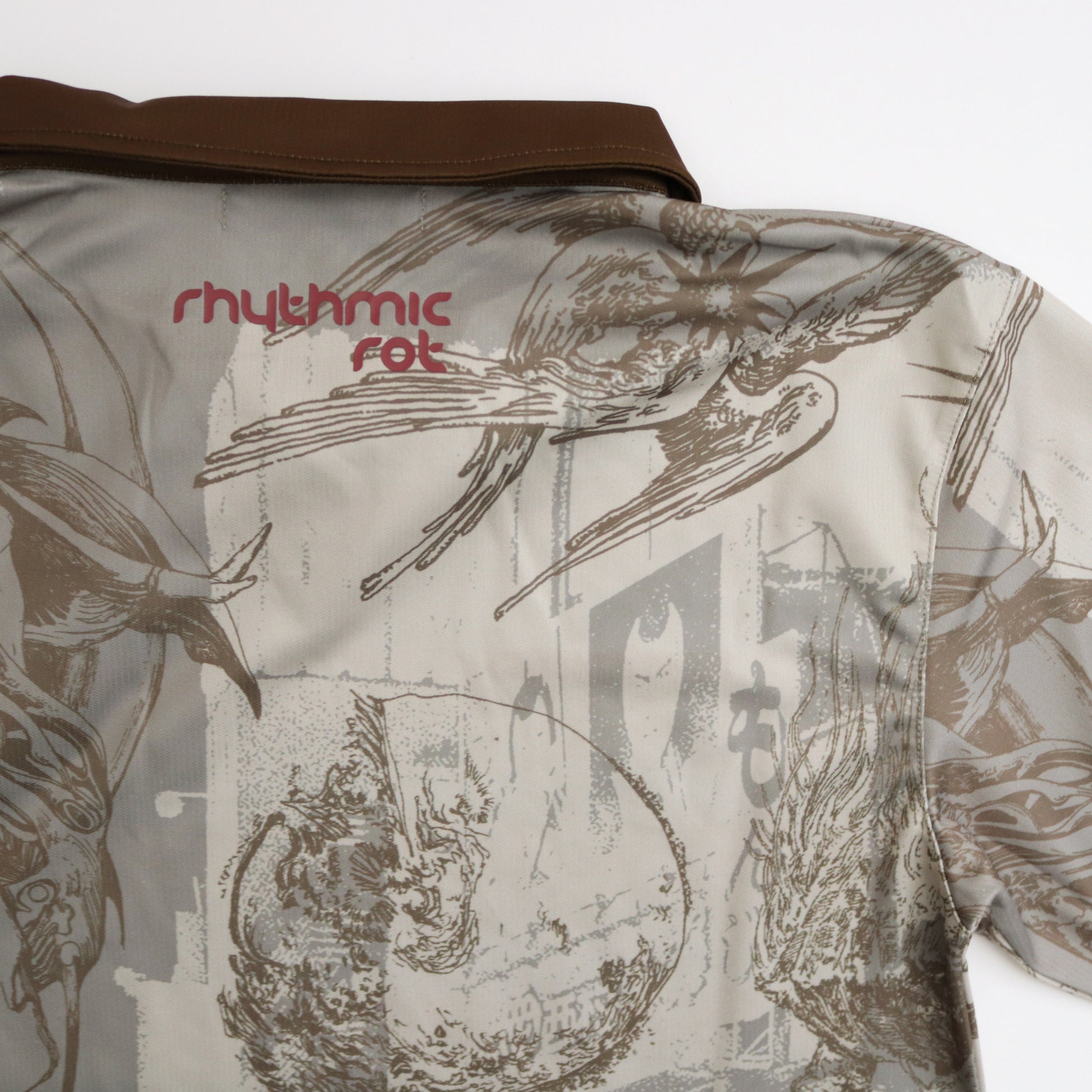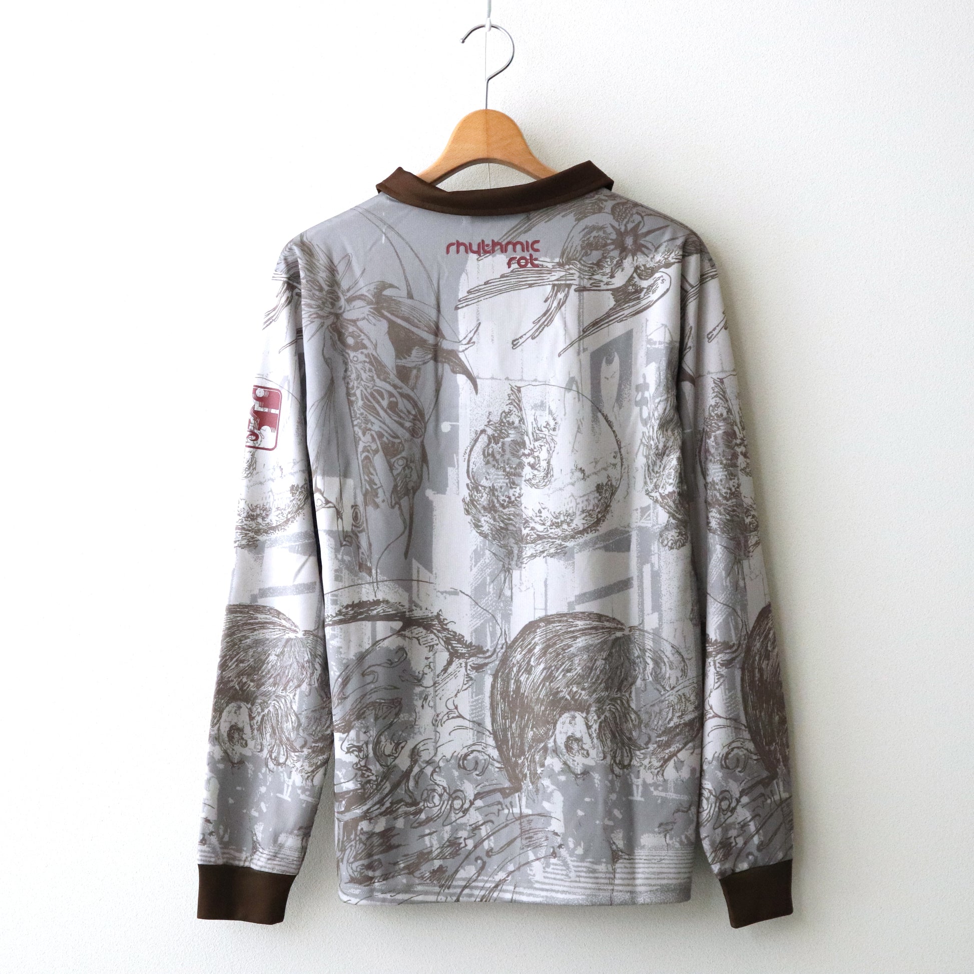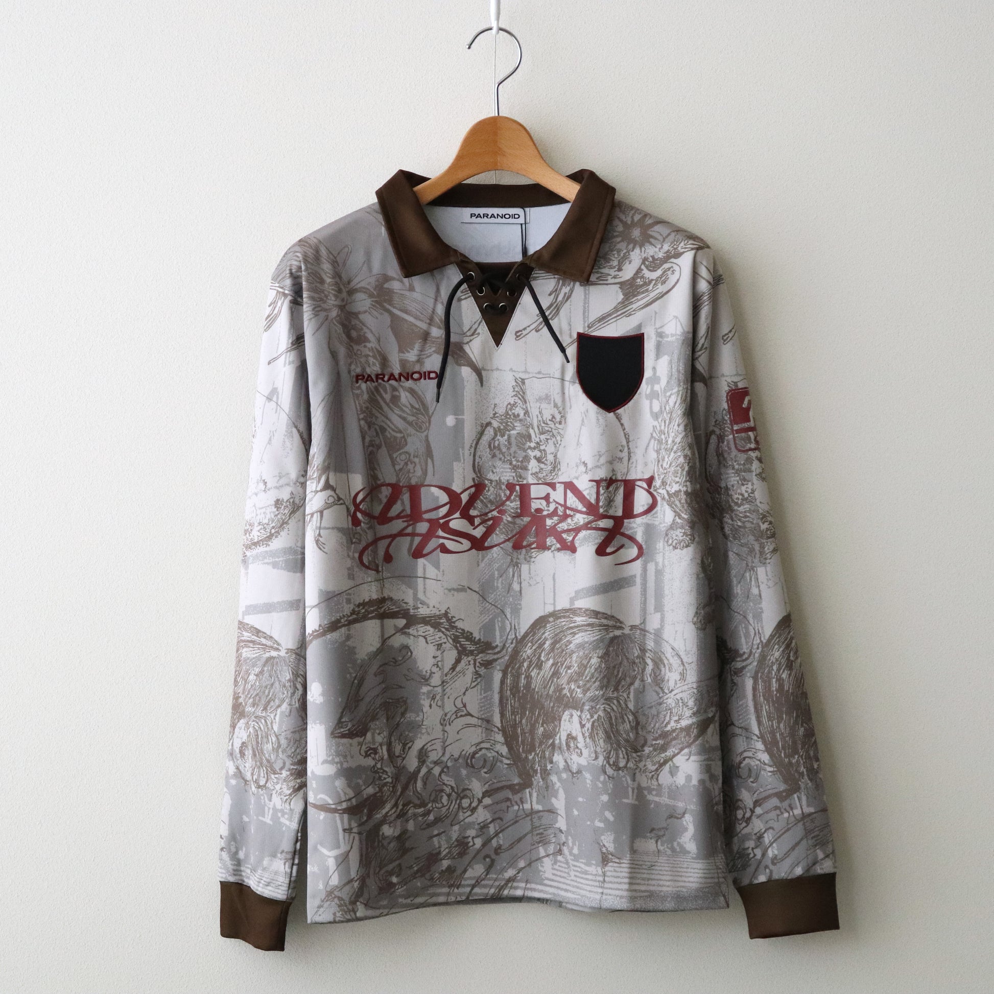 PARANOIDのゲームシャツ。光沢のある生地感とインパクトのあるグラフィックが特徴。襟元のレースアップと袖はリブ切り替え。フロントにはブランドロゴ刺繡。 総柄のグラフィックデザインにはデザイナー自ら撮影した渋谷の街並みにシーズンテーマである “RYUKAI”を彷彿とさせるイラストを重ねた。